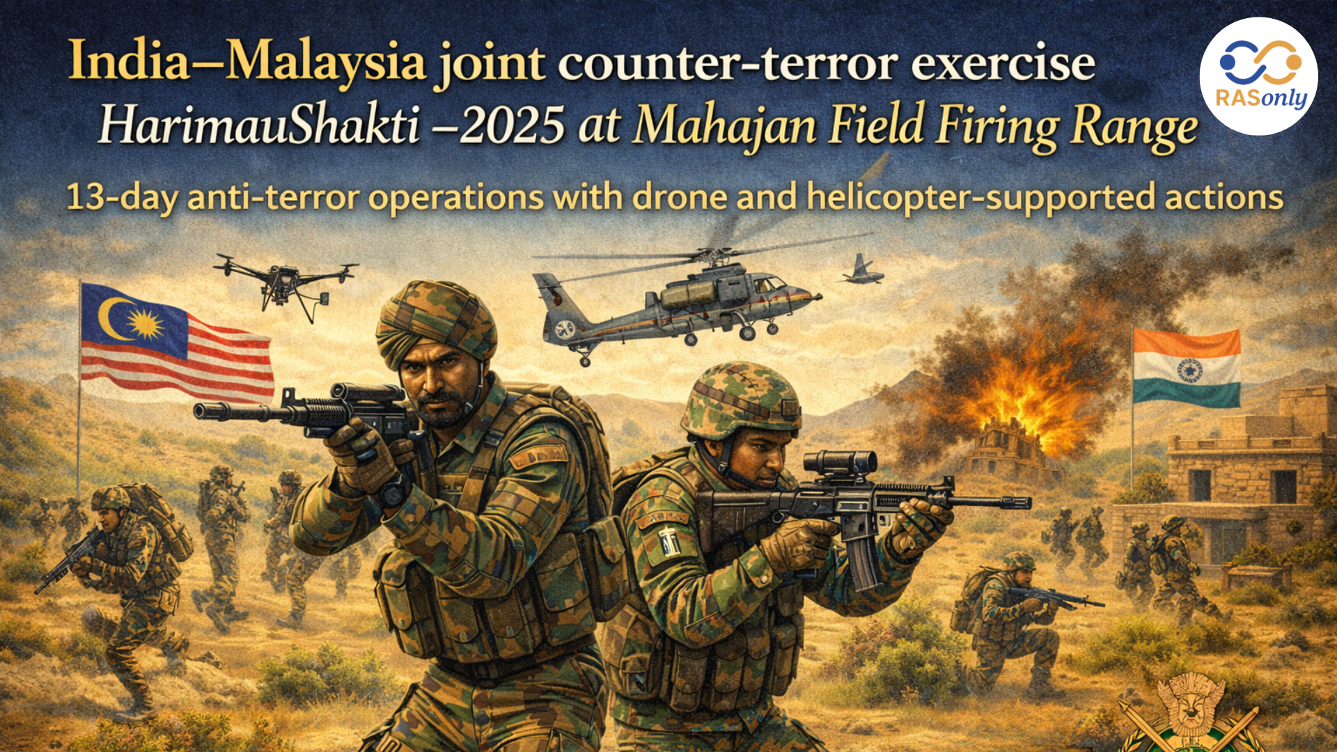 According to reports dated 21-12-2025, India and Malaysia conducted a 13-day counter-terrorism drill/exercise at the Mahajan Field Firing Range on the western border. The joint training focused on anti-terror operations and testing war skills in desert-like conditions. The report mentions drone-based operations/attacks and helicopter-supported operations, along with field-level tactical drills aimed at neutralising terrorists in a simulated environment. The joint activity concluded with the completion of the exercise “HarimauShakti -2025.”
