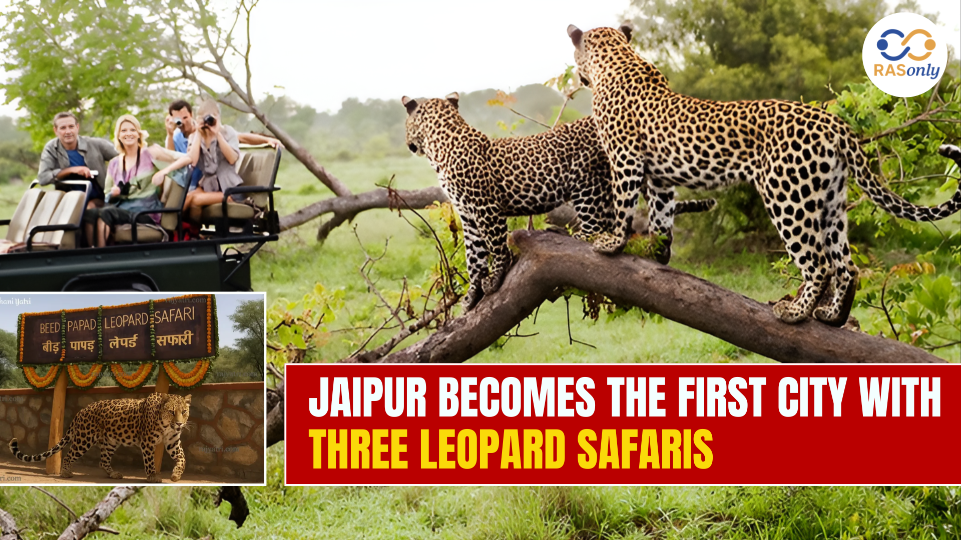 A news graphic states that Jaipur has become the first city to offer three leopard safaris. It also mentions additional wildlife tourism offerings such as a leopard reserve, an elephant and lion safari, and a tiger safari. The focus is on the Beed Papad Leopard Safari (Vidyadhar Nagar) and how this safari ecosystem strengthens Jaipur’s position as an urban wildlife tourism destination. The safari route is linked to the Aravalli hills, and the graphic provides timings, distances, and notable features of the area.