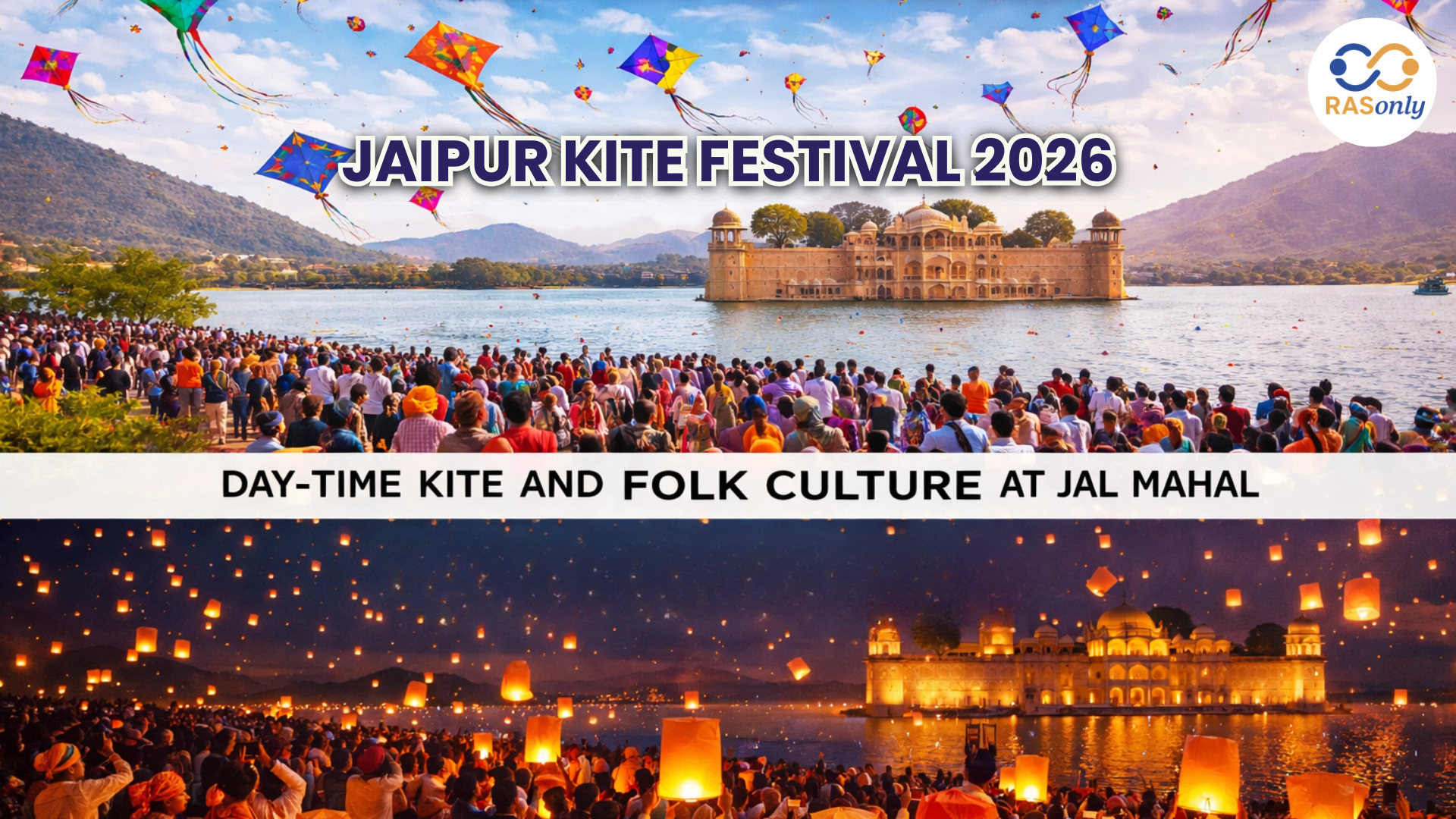 जयपुर काइट फेस्टिवल 2026—दिन में जलमहल पर पतंगोत्सव और लोक-संस्कृति, शाम को हवामहल की पृष्ठभूमि में लालटेन उत्सव और आतिशबाज़ी