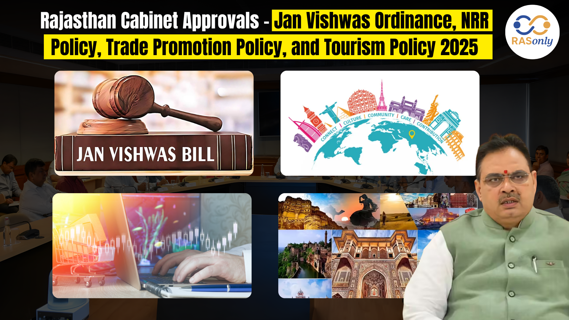 विषय: राजस्थान मंत्रिमंडल द्वारा जन विश्वास अध्यादेश, एनआरआर नीति, व्यापार प्रोत्साहन नीति एवं पर्यटन नीति 2025 की स्वीकृति