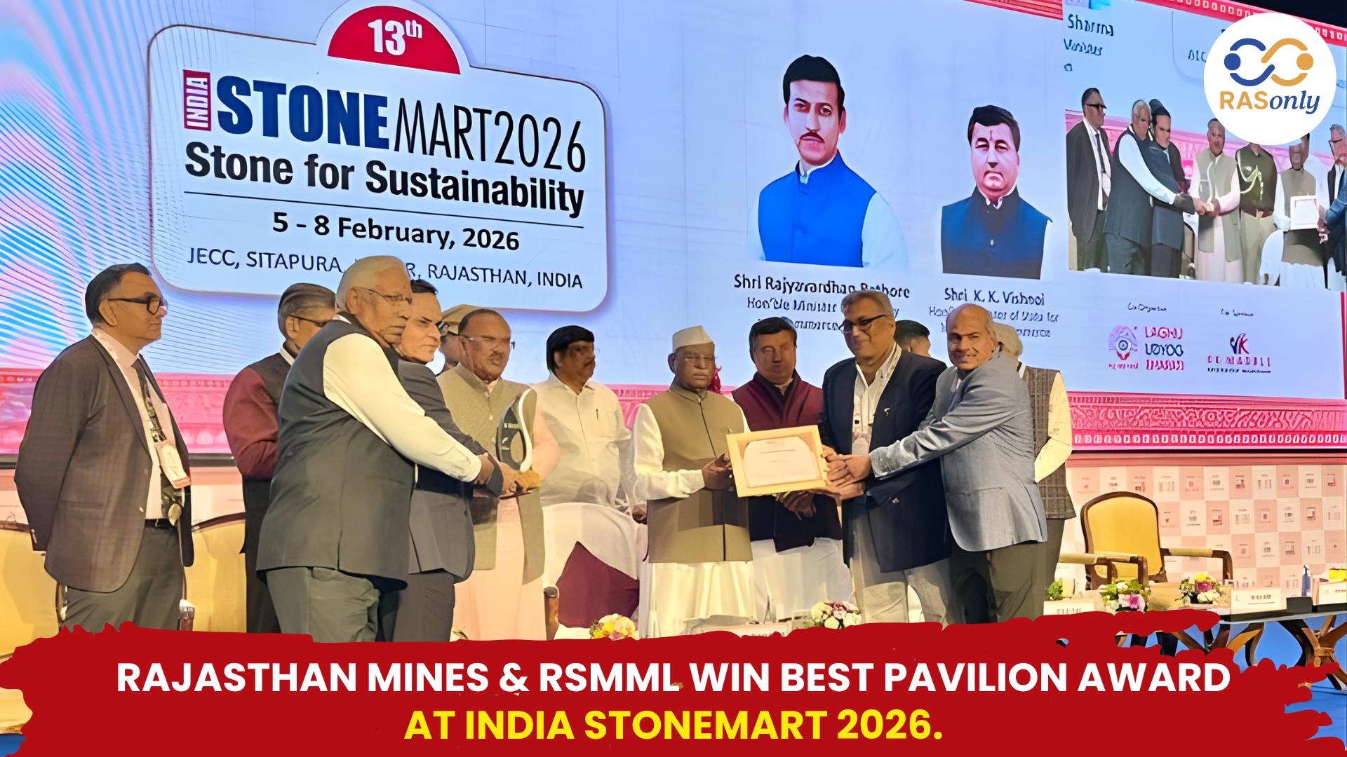 व्याख्या: समाचार के अनुसार इंडिया स्टोन मार्ट 2026 में ‘सरकारी पेवेलियन’ श्रेणी में श्रेष्ठ प्रदर्शन के लिए प्रथम पुरस्कार राजस्थान खान एवं भूविज्ञान विभाग तथा राजस्थान राज्य खान एवं खनिज लिमिटेड (आरएसएमएम) को प्रदान किया गया।