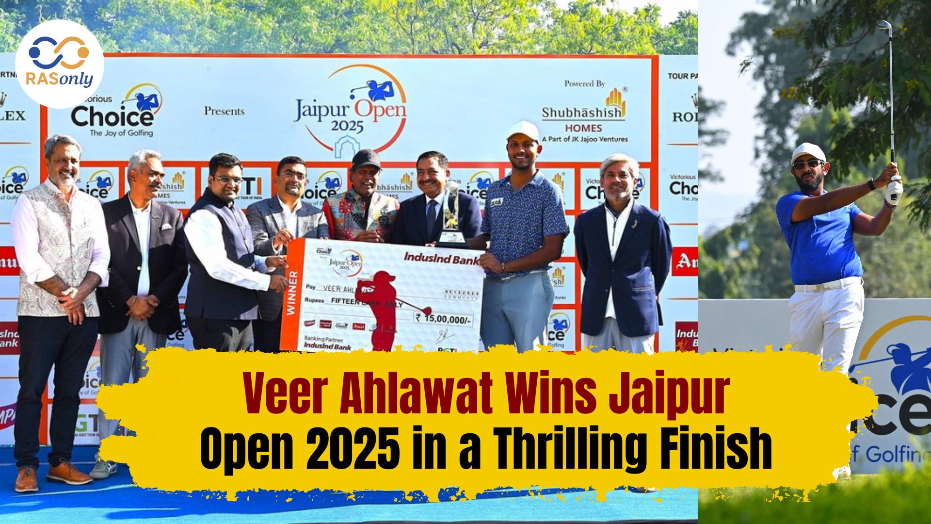 जयपुर ओपन गोल्फ टूर्नामेंट 2025 में वीर अहलावत ने शानदार वापसी करते हुए युवराज संधू को कड़े मुकाबले में मात देकर खिताब अपने नाम किया। रामबाग गोल्फ क्लब में खेले गए इस टूर्नामेंट के अंतिम राउंड में वीर रातों-रात चौथे स्थान पर थे और लीडर से पाँच स्ट्रोक पीछे थे। हालांकि उन्होंने बेहतरीन, बोगी-रहित 8-अंडर 62 का स्कोर खेलते हुए कुल 19-अंडर 261 के स्कोर के साथ खिताब जीत लिया। उनकी इस उत्कृष्ट जीत ने न केवल उन्हें जयपुर ओपन चैम्पियन बनाया, बल्कि उन्हें पीजीटीआई ऑर्डर ऑफ मेरिट में 18वें स्थान पर पहुंचा दिया। युवराज संधू ने 18-अंडर 262 के साथ दूसरा स्थान प्राप्त किया, जबकि शुभंकर ने 15-अंडर 265 के साथ तीसरा स्थान हासिल किया।