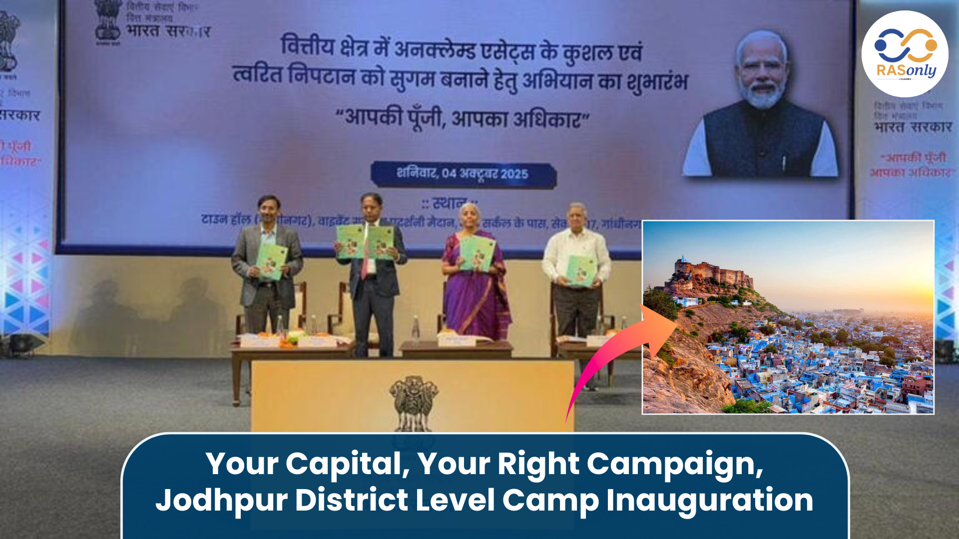 वित्त मंत्रालय के वित्तीय सेवाएं विभाग द्वारा संचालित राष्ट्रव्यापी ‘आपकी पूँजी, आपका अधिकार’ अभियान के तहत जोधपुर जिले के जिला स्तरीय शिविर का शुभारंभ काजरी ऑडिटोरियम में संसदीय कार्य, विधि एवं विधिक कार्य मंत्री श्री जोगाराम पटेल ने किया। अभियान का उद्देश्य नागरिकों को उनकी दावा न की गई जमा राशि, बीमा आय, डिविडेंड, शेयर, म्यूचुअल फंड बैलेंस और पेंशन देनदारियों को खोजने और दावा करने में सक्षम बनाना है। 4 अक्टूबर को गांधीनगर में केंद्रीय वित्त मंत्री द्वारा राष्ट्रीय शुभारंभ के बाद यह शिविर आमजन तक वित्तीय जागरूकता पहुँचाने का बड़ा माध्यम बना है। जोधपुर में 3 लाख अनक्लेम्ड खातों में ₹115 करोड़ जमा है, जिससे अभियान की प्रासंगिकता बढ़ जाती है।