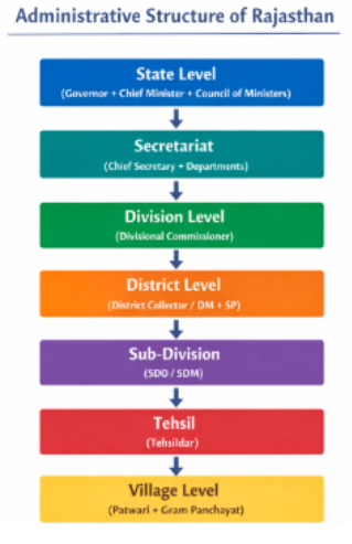 The Administrative Structure of Rajasthan is a well-defined and multi-layered governance system designed to ensure effective administration, law and order, revenue management, and socio-economic development across the state. Rajasthan follows a decentralized administrative model, where authority flows from the state government to divisions, districts, sub-divisions, tehsils, and villages.
