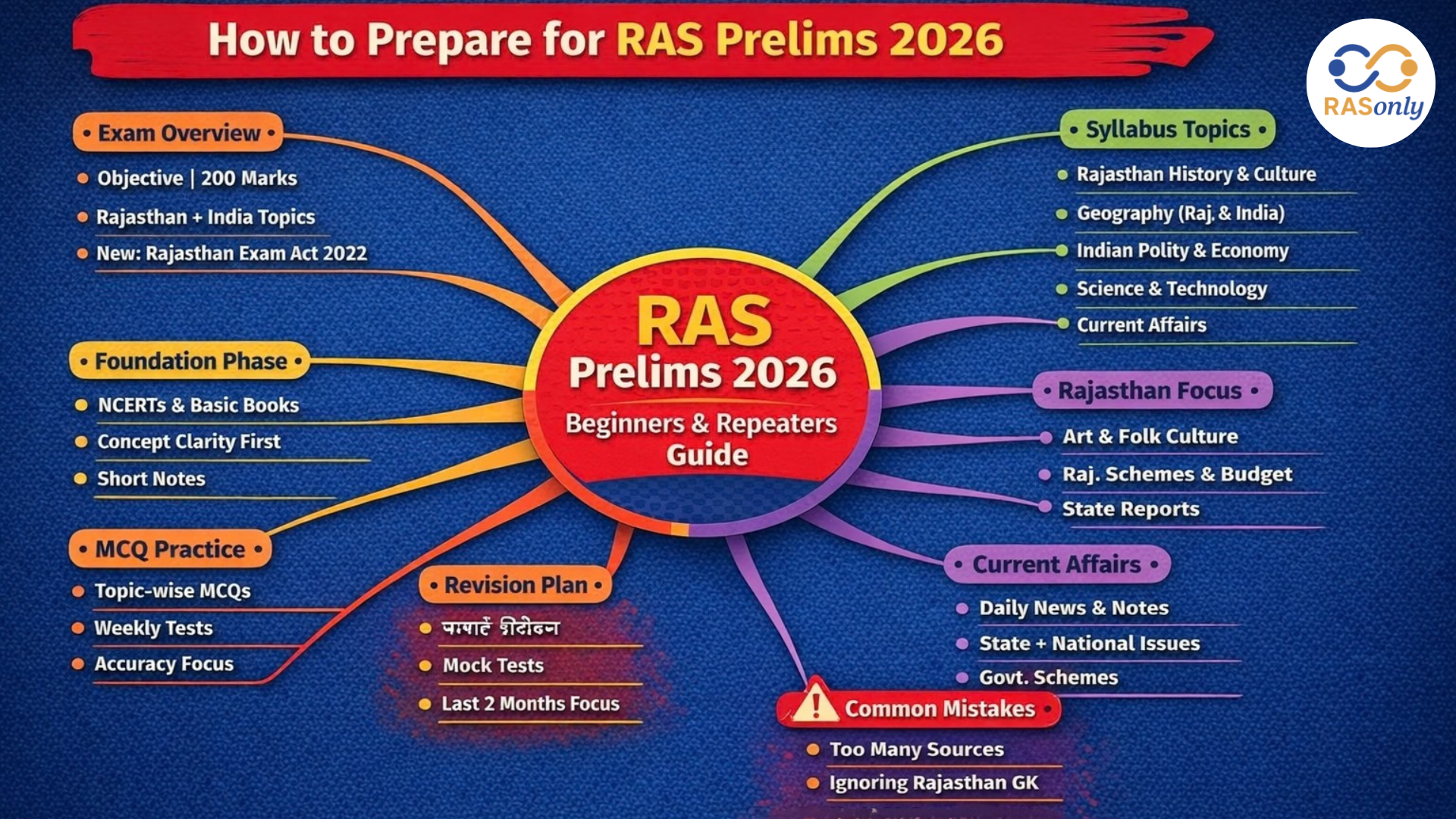 Preparing for RAS Prelims 2026 requires a clear understanding of the syllabus, a Rajasthan-centric approach, and consistent MCQ practice. Focus on concept clarity, regular revision, and current affairs while giving special attention to the Rajasthan Examination Act, 2022. With a structured study plan, smart revision, and mock test analysis, beginners and repeaters can confidently clear the screening stage and move towards RAS Mains success.