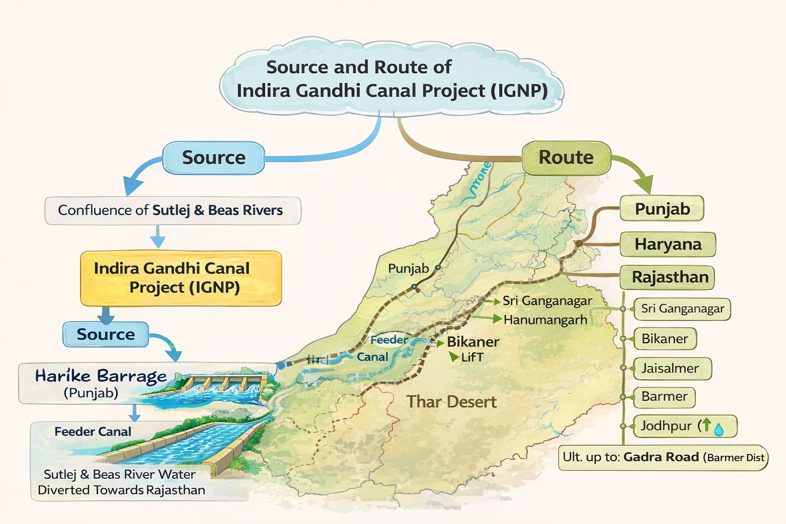 Indira Gandhi Canal project is a high-weight subject in Rajasthan-related competitive examinations. It is commonly related to the themes of desert development, irrigation planning, environmental impact, and regional transformation.