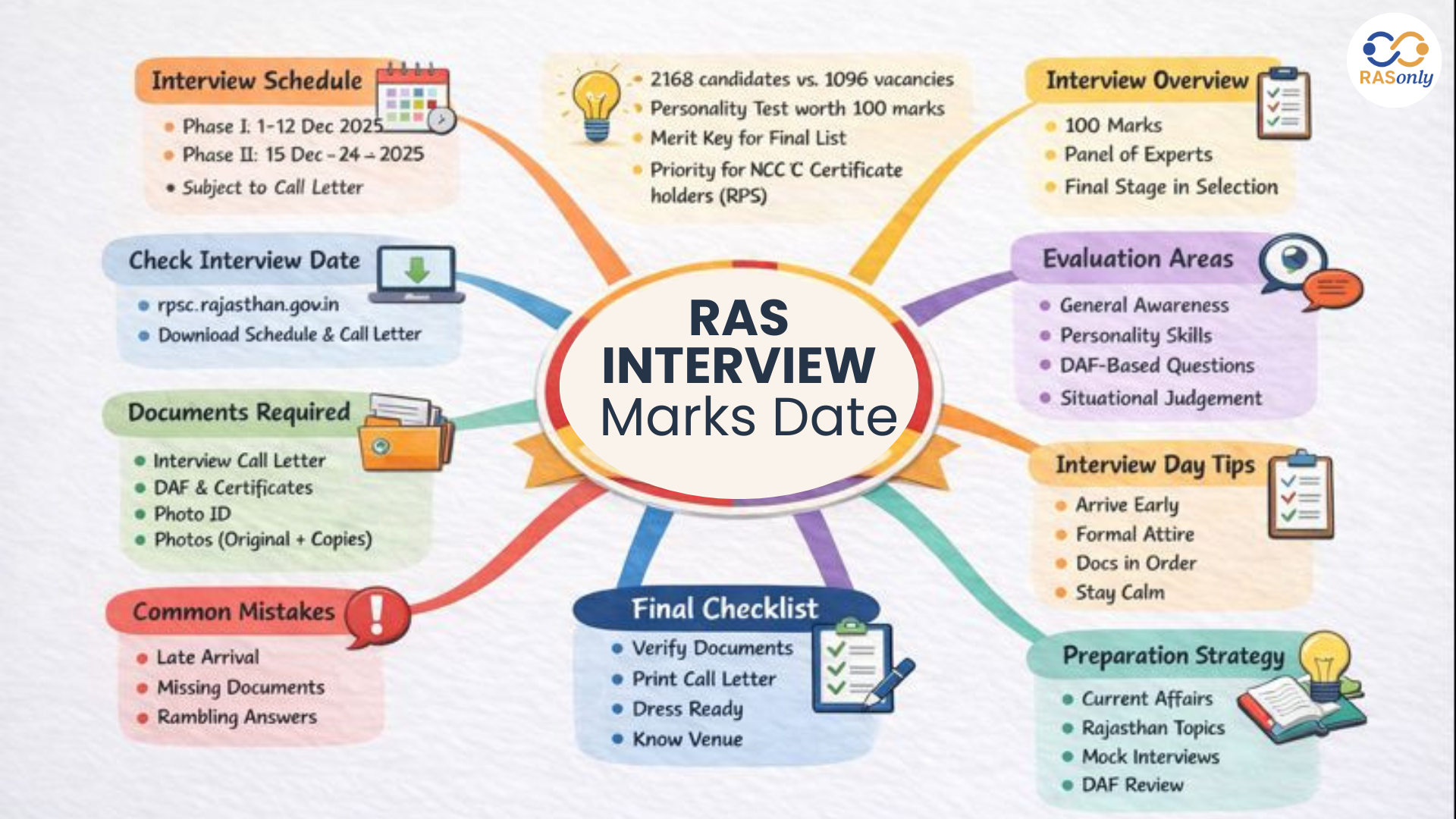 The RPSC RAS Interview 2024 is the final Personality Test carrying 100 marks for candidates qualified in RAS Mains. It evaluates character, communication skills, ethical judgment, administrative aptitude, physique, and knowledge of Rajasthani culture. Interview performance, combined with Mains marks, determines the final merit list, with NCC ‘C’ certificate holders getting preference in RPS selection.