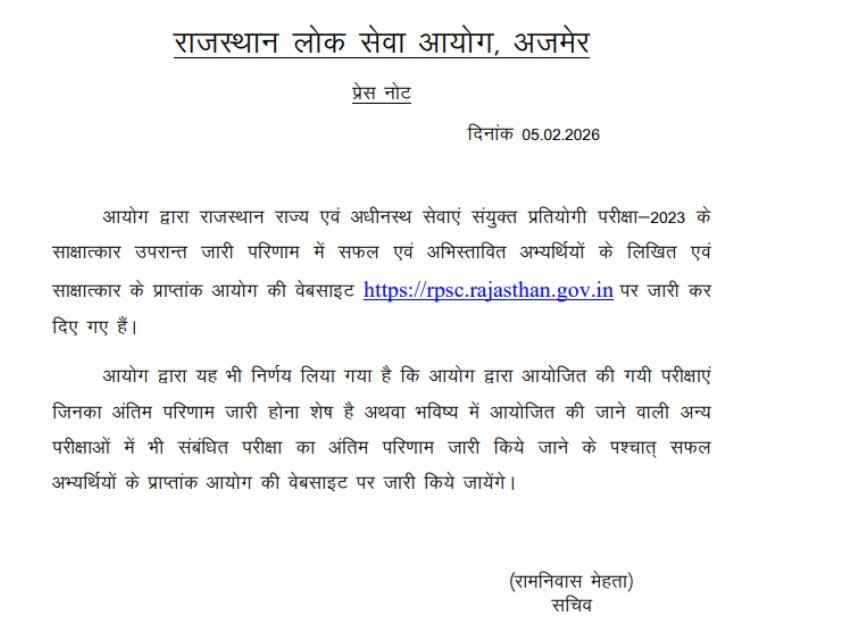 The authority has announced the Rajasthan RPSC RAS/RTS 2023 Final Result 2026 on its official website on 05 February 2026.