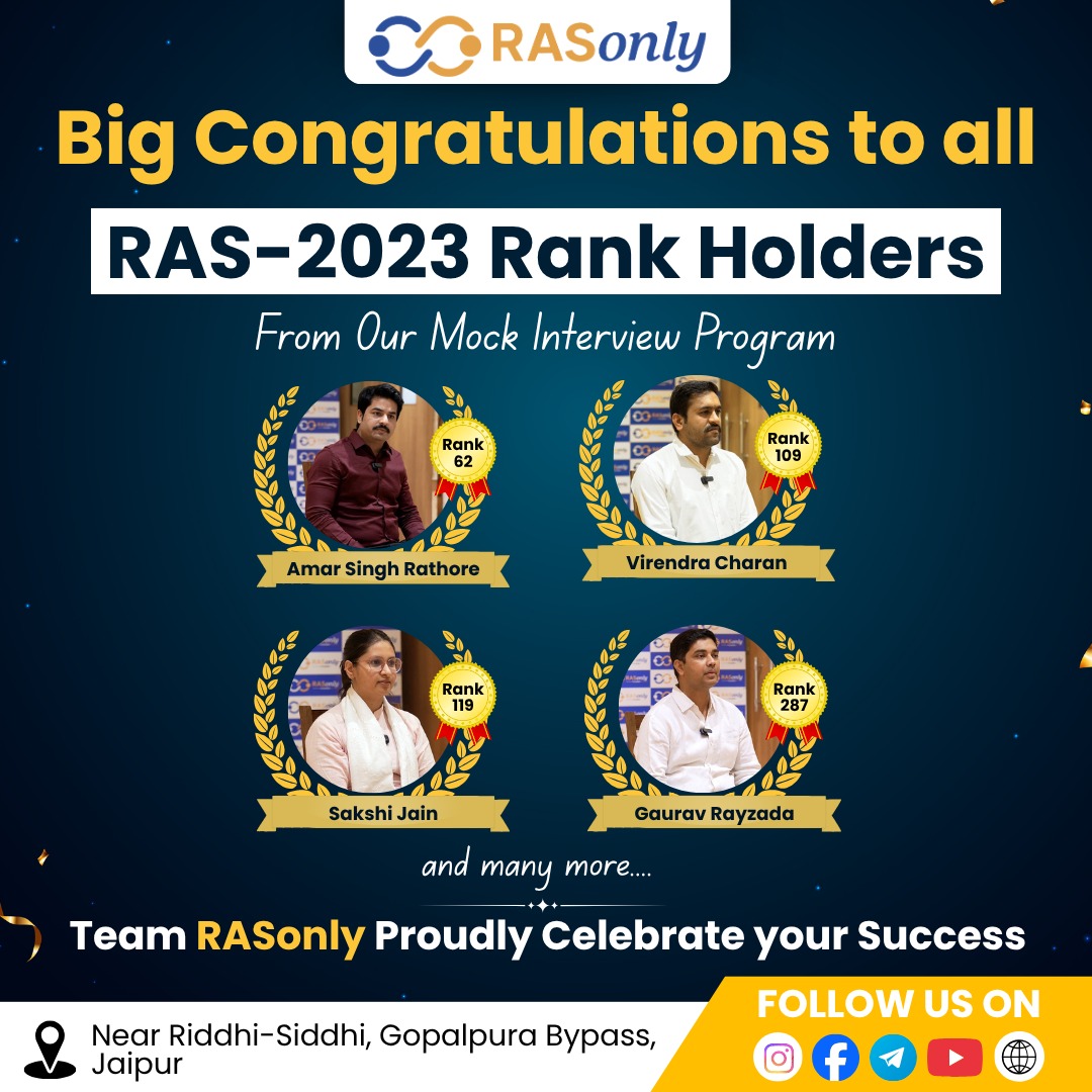 We are proud to announce that Amar Singh Rathore, a participant in the RASonly Mock Interview Program, secured an impressive 62nd rank in the RPSC RAS 2023 final results. Virendra Charan secured 109nd rank, Sakshi Jain secured 119nd rank, and Gaurav Rayzada secured 287nd rank. We are proud to announce that all participants in the RASonly Mock Interview Program have secured impressively good ranks in the RPSC RAS 2023 final results. Their success is a testament to the quality of preparation, expert guidance, and realistic interview simulations provided by our RASonly platform.